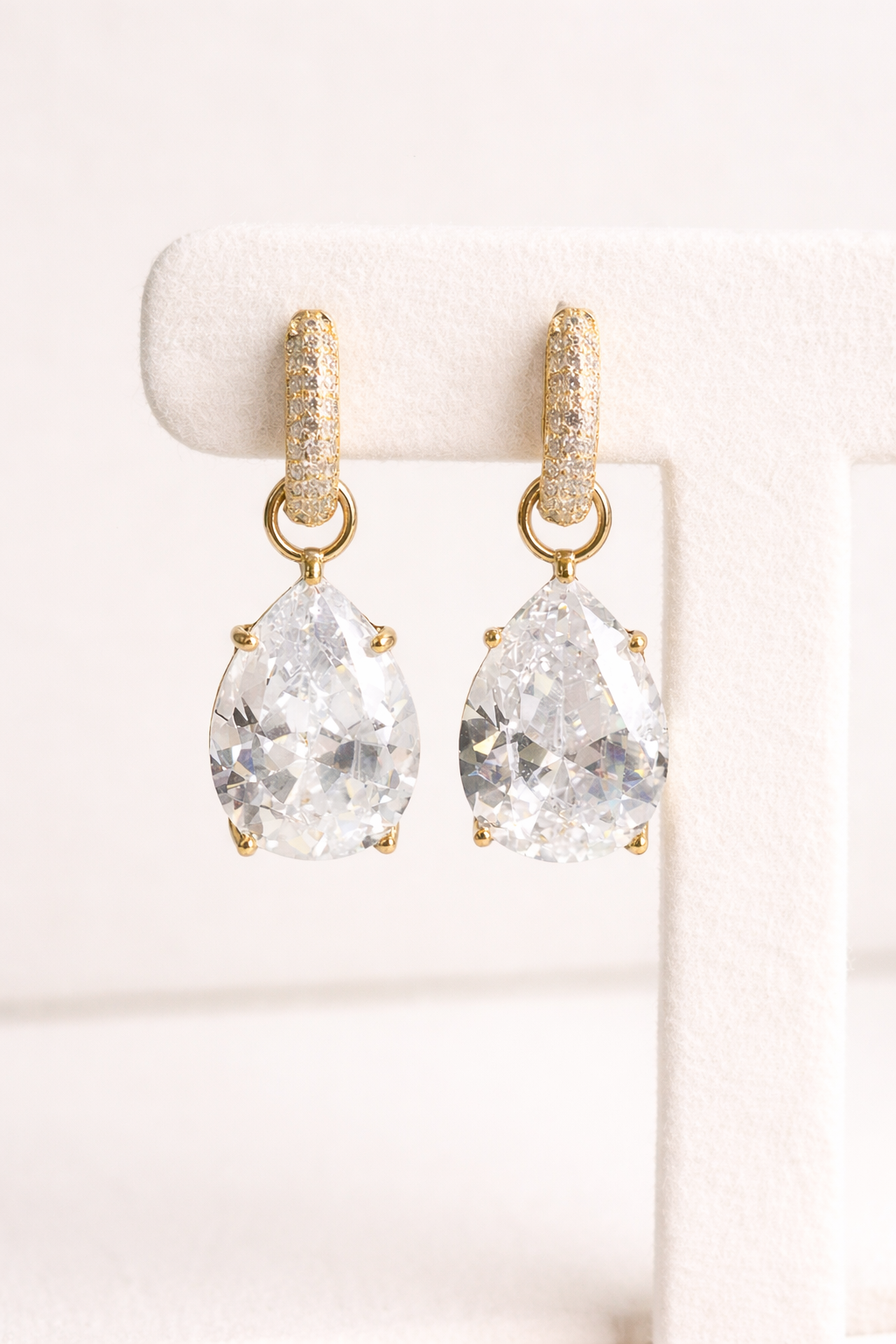 Brinco com zircônia em lapidação gota, banho de ouro 18k e argola cravejada — clássico, atemporal e extremamente versátil 🤍