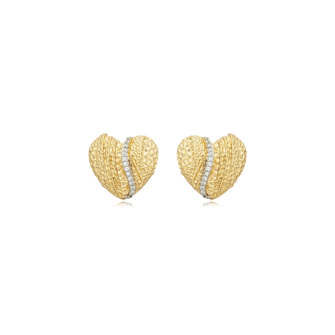 Brinco de coração martelado cravejado de zirconia cristal banho em ouro 18k