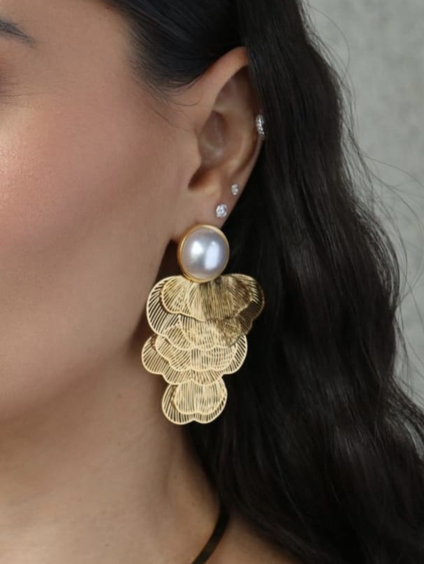 Elegante e sofisticado, este brinco combina o charme clássico da pérola com o design moderno das folhas douradas. Banhado a ouro 18k, ele apresenta uma estrutura leve e detalhadamente texturizada, que reflete a luz com delicadeza. A pérola central traz um toque de requinte, tornando-o perfeito para eventos especiais, jantares e ocasiões que pedem um visual marcante.