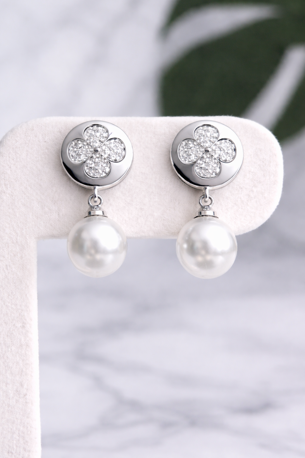 Brinco Trevo com Pérola Shell – Banho de Ródio Branco
