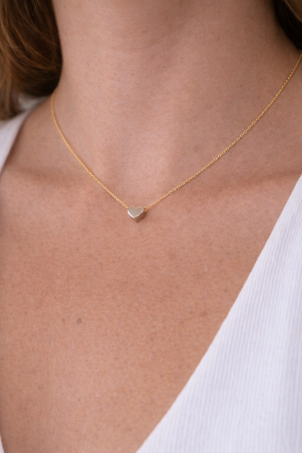 Colar com corrente no banho de ouro 18k e coração no banho de rodio branco.
